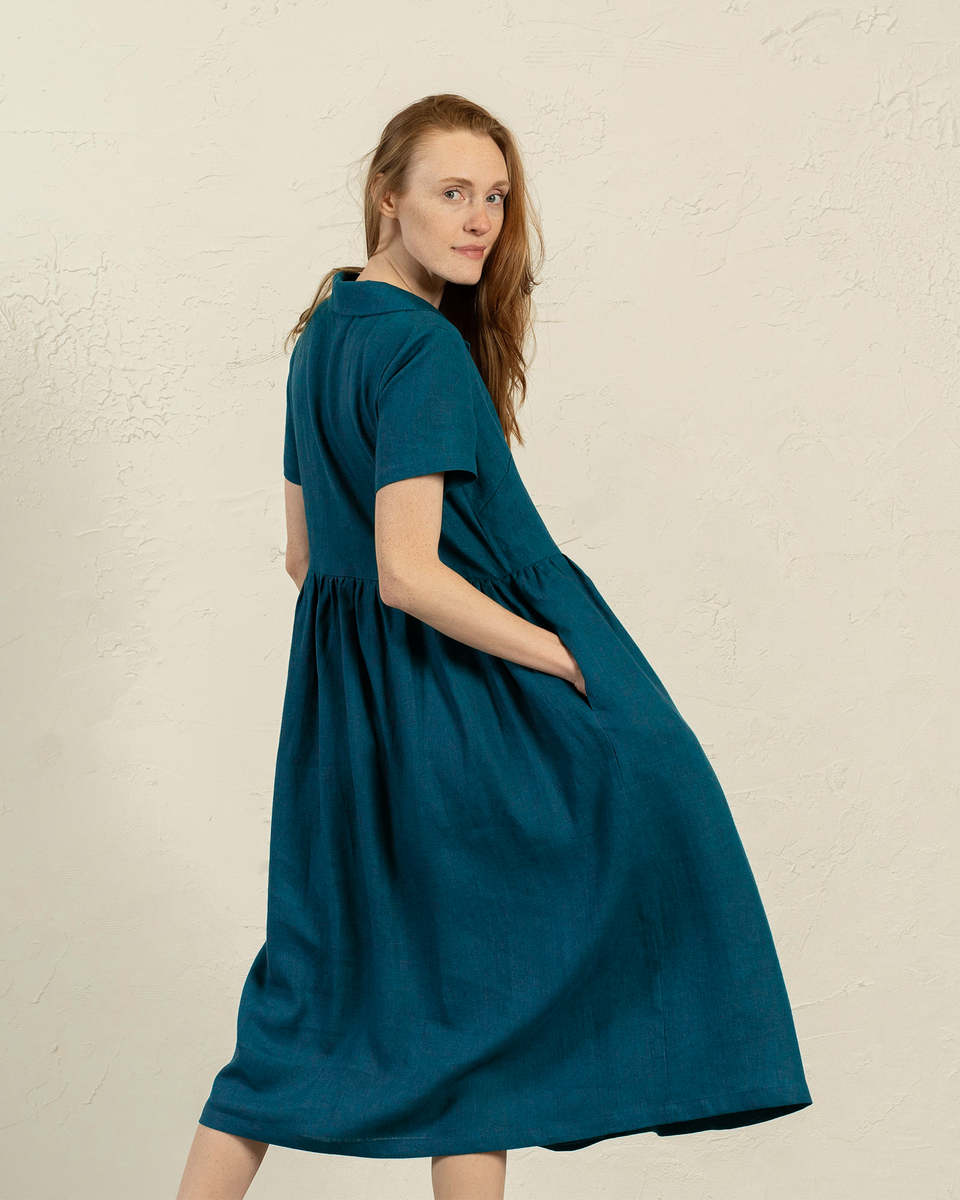 El vestido Phoebe es fiel a la talla y tiene un corte holgado. A medida que usas la prenda durante el día, se suaviza y relaja de forma natural para mayor comodidad. Ideal para cuerpos con forma de reloj de arena, pera, manzana, rectángulo y triángulo invertido.