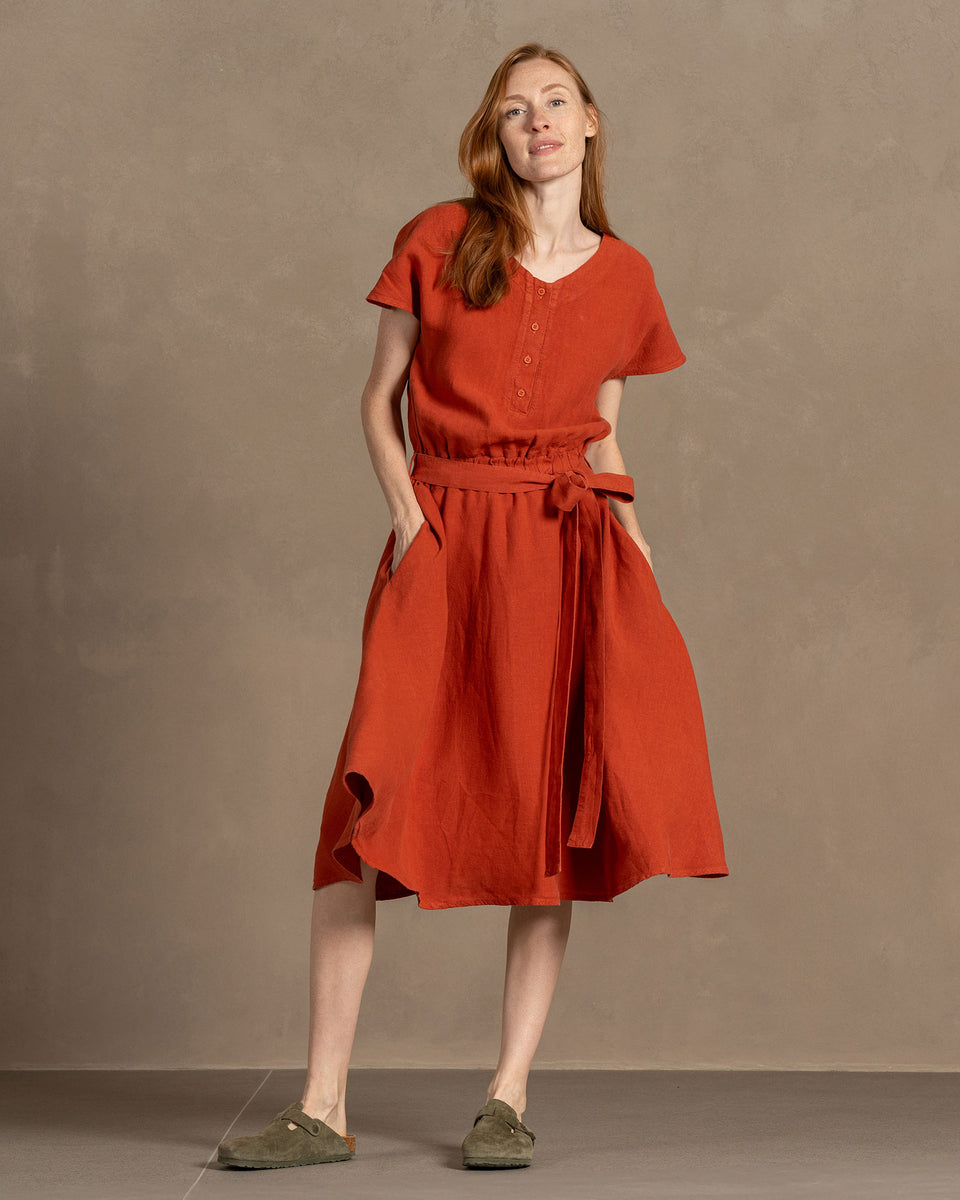 El vestido Brigit tiene un corte holgado y corresponde a la talla habitual. Ten en cuenta que la prenda se suaviza y afloja de forma natural a medida que la usas durante el día. Se volverá más cómoda conforme te muevas con ella.
