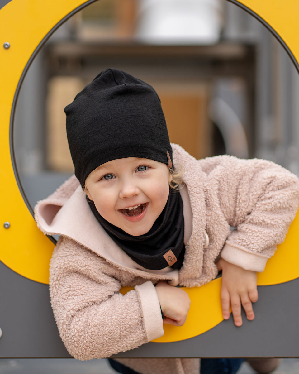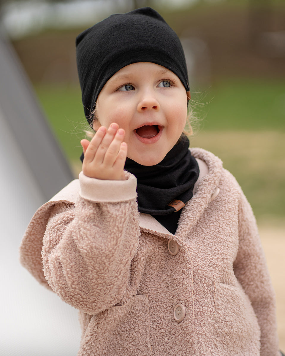 Made from 100% Merino wool double 160gsm material, this beanie and neck gaiter 2-piece set is a great addition to kids’ wardrobes for spring, fall, and in-between seasons. Merino wool naturally traps warm air, providing excellent thermal protection without feeling bulky. Kids' hat & scarf set breathable, temperature-regulating fibers absorb moisture vapor from the skin and release it into the air, helping kids stay dry and comfortable during any activity. Keep your little one cozy, happy, and ready for every adventure – no matter the weather.