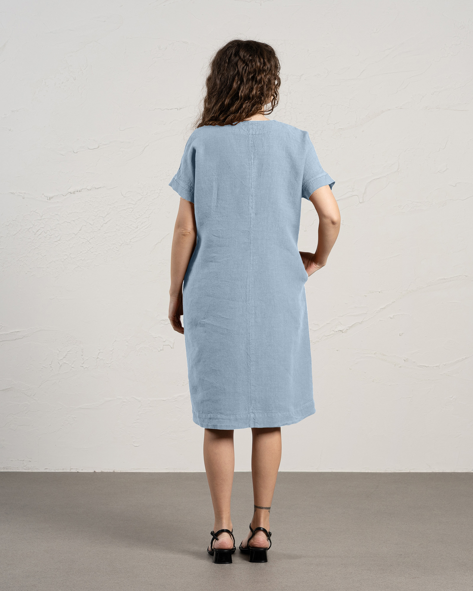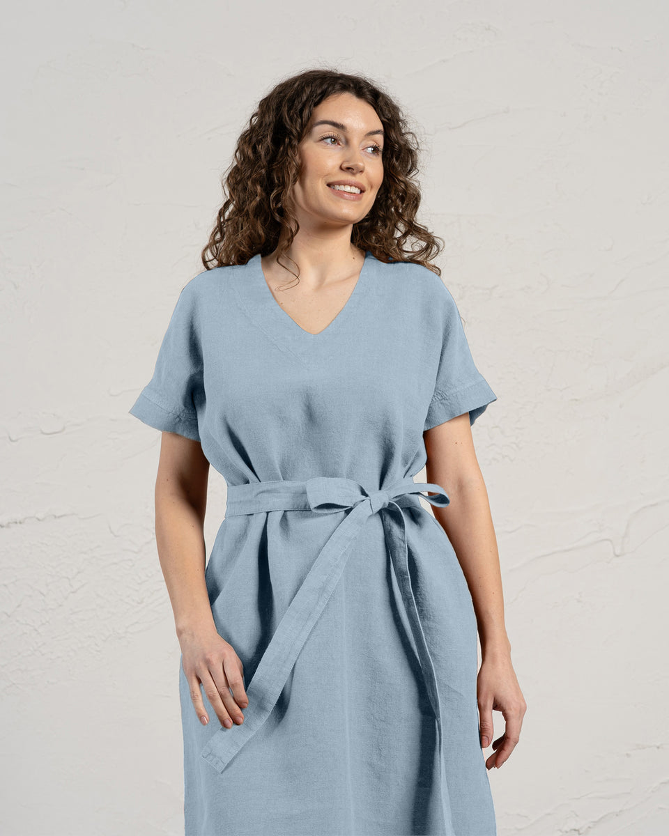 Joelle dress is made from 100% Linen fabric, featuring a flattering V-neckline, a relaxed and roomy silhouette, and midi length which elongates your figure so you look taller and slimmer. Linen tunic also comes with a tie belt that can define your waist. The flowy Linen dress has two hidden inseam pockets that are wonderful catch-alls for any little thing you need or just a perfect place to put your hands in.
