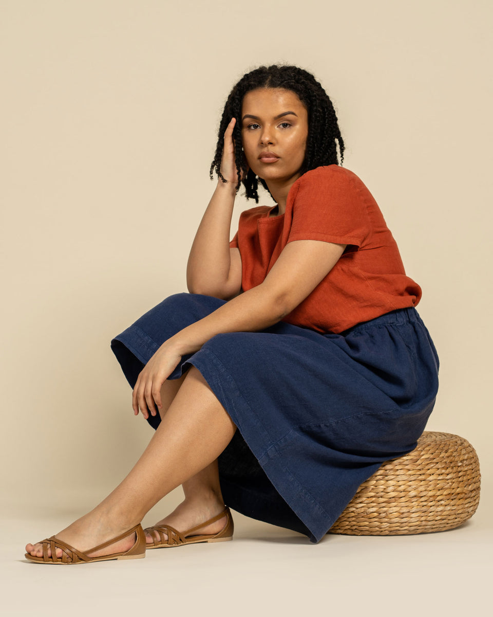 Organic Linen skirt perfect for plus sized body shape. Midi skirt Sophia offers a blend of simplicity, elegance, and romance tailored to flatter the curvy figure. Crafted from 100% organic and natural linen, Linen A-line skirt is designed to provide comfort and style for various occasions, from casual Fridays to leisurely strolls at the local farmer's market. Plus size skirt gracefully flows away from the body, ensuring a curve-friendly style. Specifically curated for plus-size customers, it features a wide and comfortable waistband along with two hidden pockets for added convenience.