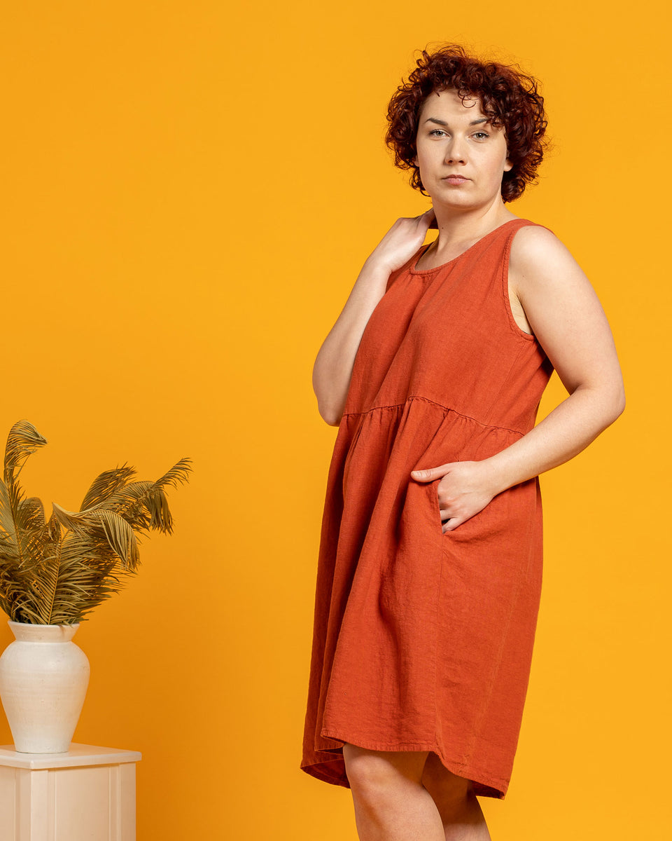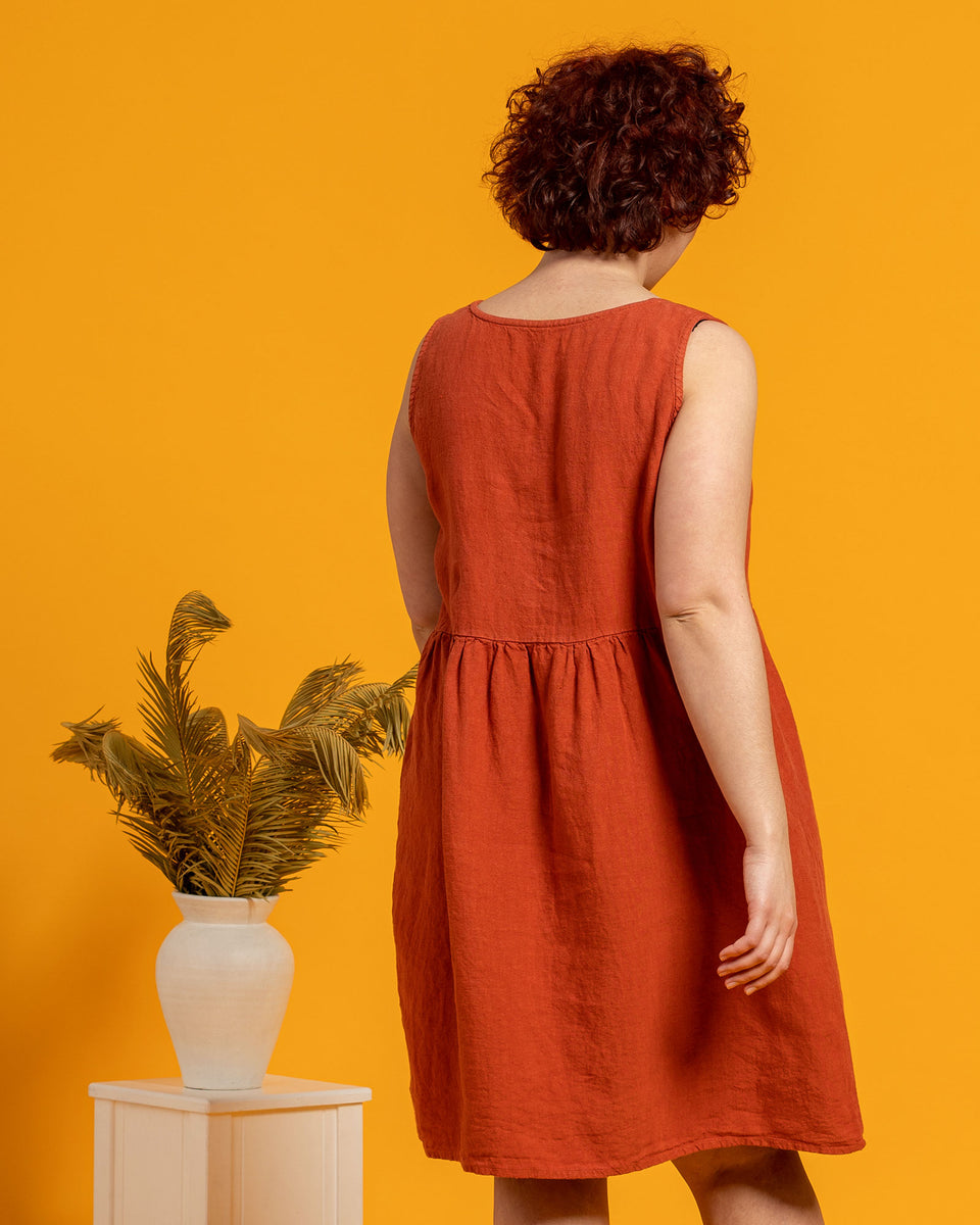 Whether you are planning to dine alfresco, travel to the beach, or simply on the hunt for a comfortable option to wear at work during hot and humid summer days – Eliza dress is essential. Made from a soft and airy 100% Linen fabric, the midi dress has all of the features a girl could want, including a flattering round neckline, a flowy hem, and adorable smock front. Inject some color into your wardrobe with our cinnamon red dress Eliza. Then, simply swap between heels, boots, and trainers depending on the occasion.