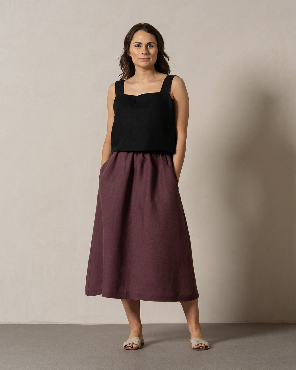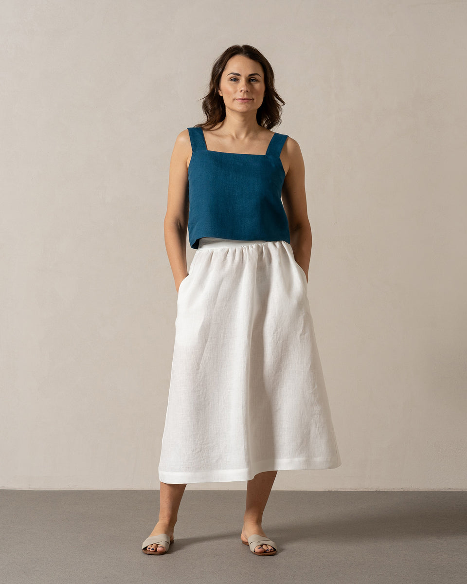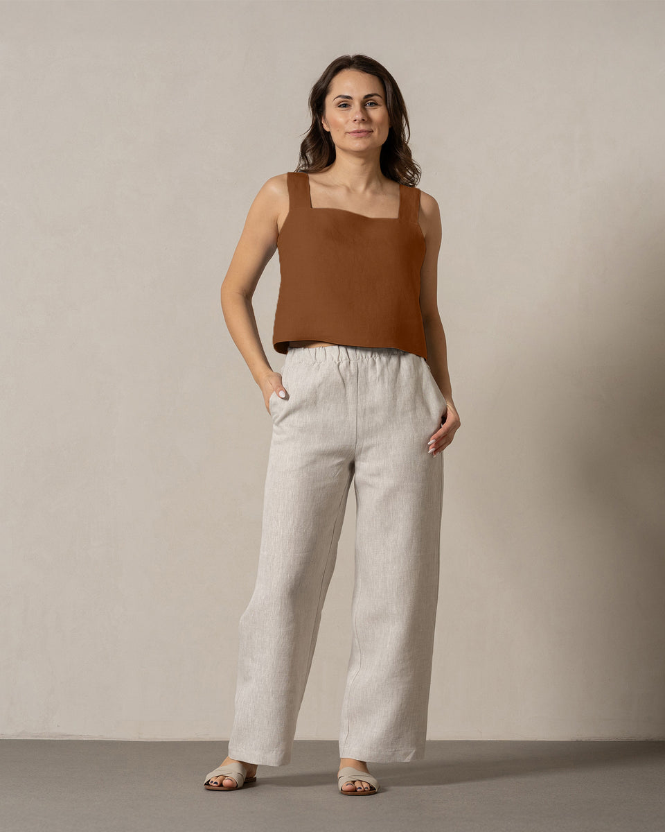 Made from 100% European linen with double 200gsm fabric for a stiffer look, this crop top features a sleeveless design and a square neckline – perfect for showcasing your shoulders and enjoying the sun. The straight silhouette flatters your figure, while the button closure at the back adds a unique touch.