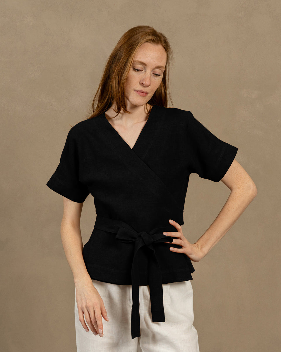 La blusa Lila ofrece un corte regular con un estilo cruzado que define la cintura y mangas tipo kimono. Elige tu talla habitual para el aspecto deseado que se muestra en las imágenes, o selecciona una talla menor para una silueta más ajustada. Ten en cuenta que la prenda se suaviza y afloja de forma natural a medida que la usas durante el día. Perfecta para embarazadas, así como para figuras en forma de manzana, rectangular o pera.