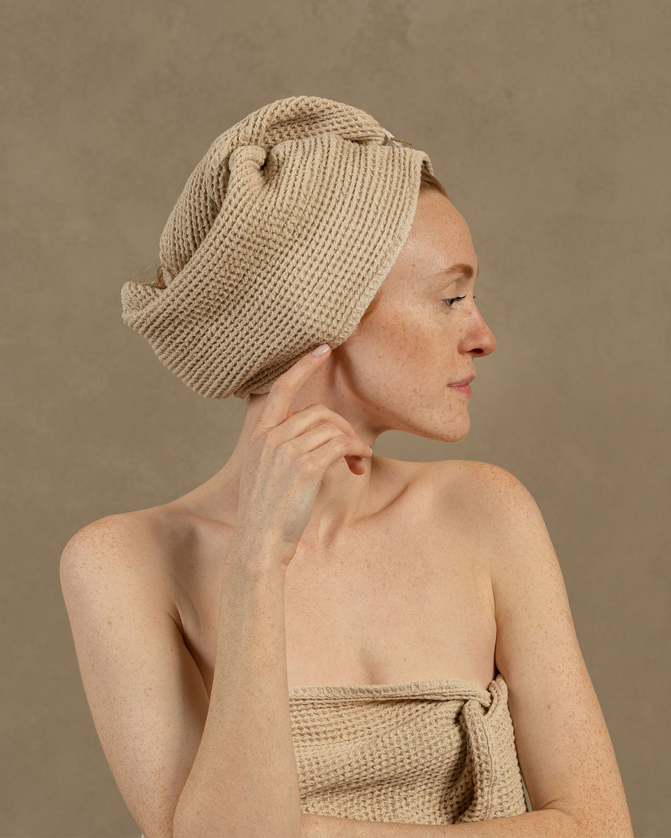 Séquese el cabello más rápido y de forma más segura con nuestra toalla para el cabello de gofre, altamente absorbente, hecha de una mezcla de lino y algodón. Con un tejido de gofre de secado rápido y un práctico cierre de botón, nuestra toalla ofrece un ajuste flexible para todo tipo de largos y volúmenes de cabello. Además, a diferencia de las telas sintéticas, las toallas de mezcla de lino reducen la fricción y mantienen la suavidad del cabello, lo que resulta en menos roturas y favorece la salud capilar.
