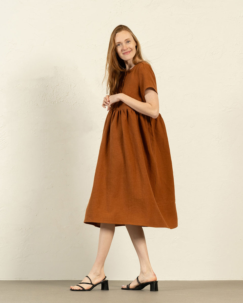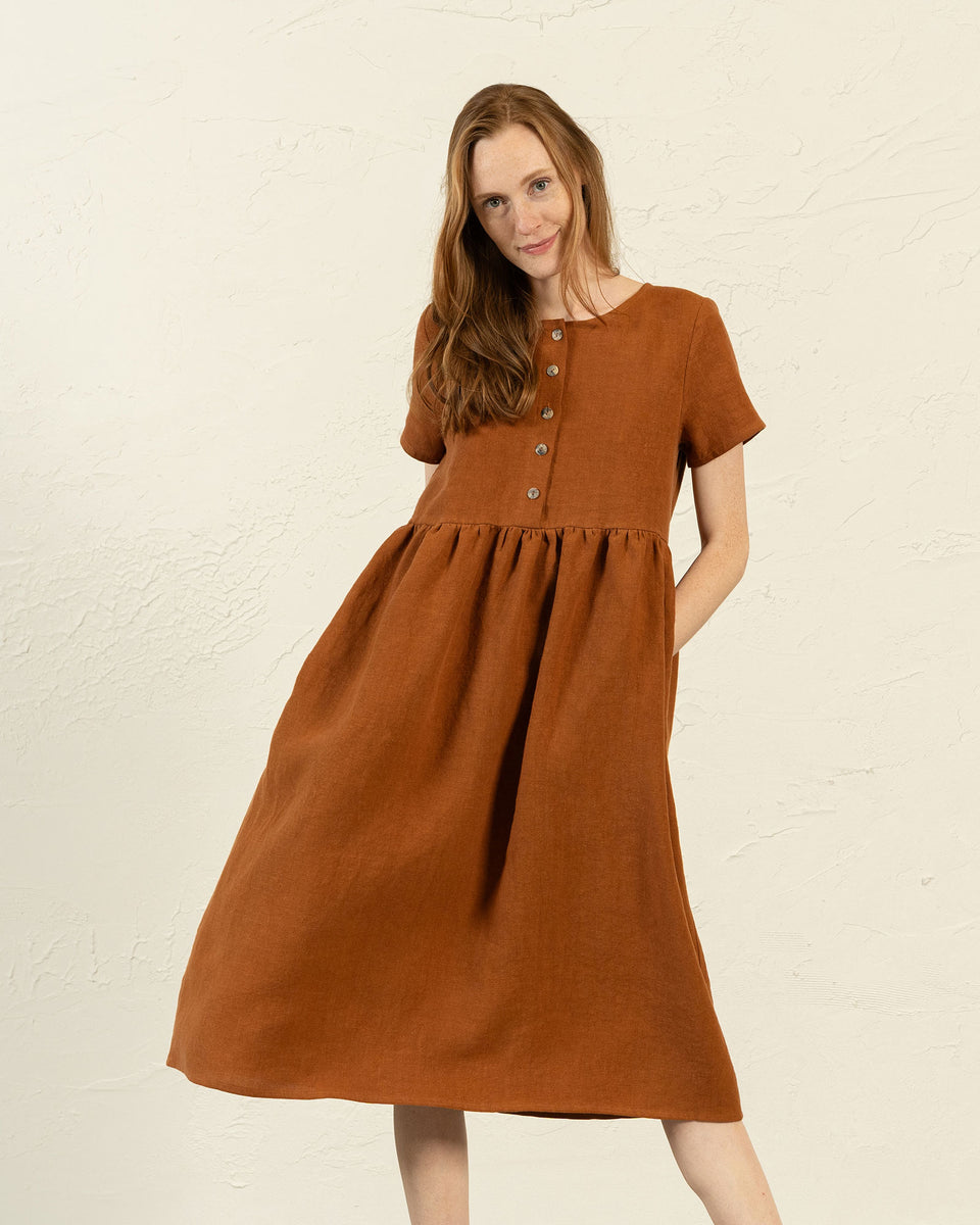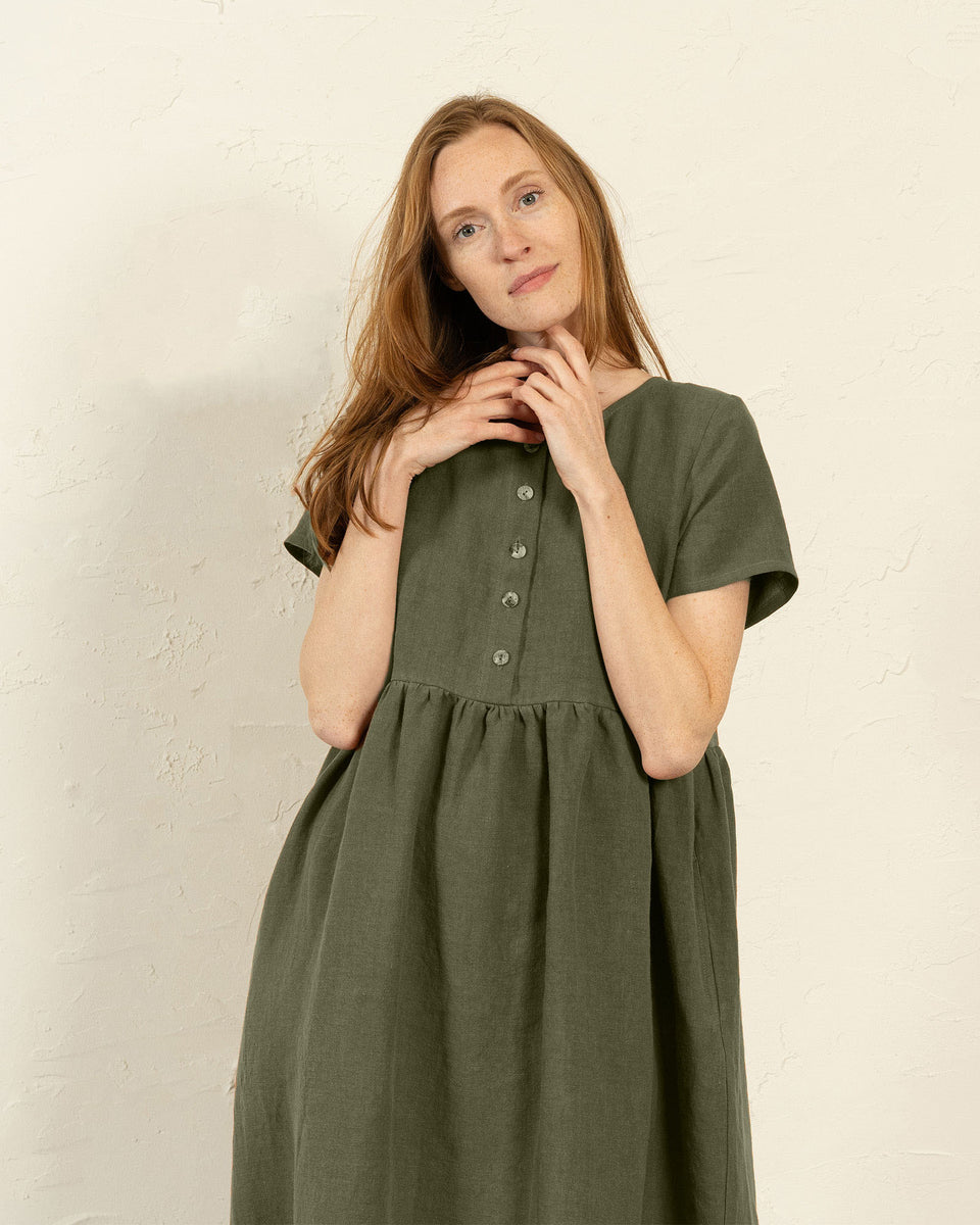 El vestido María presenta un corte holgado y cómodo, este vestido 100% lino combina un escote redondo, dos bolsillos ocultos y mangas cortas insertadas. Además, una abertura frontal con botones funcionales permite amamantar con facilidad, por lo que es adecuado para madres lactantes.