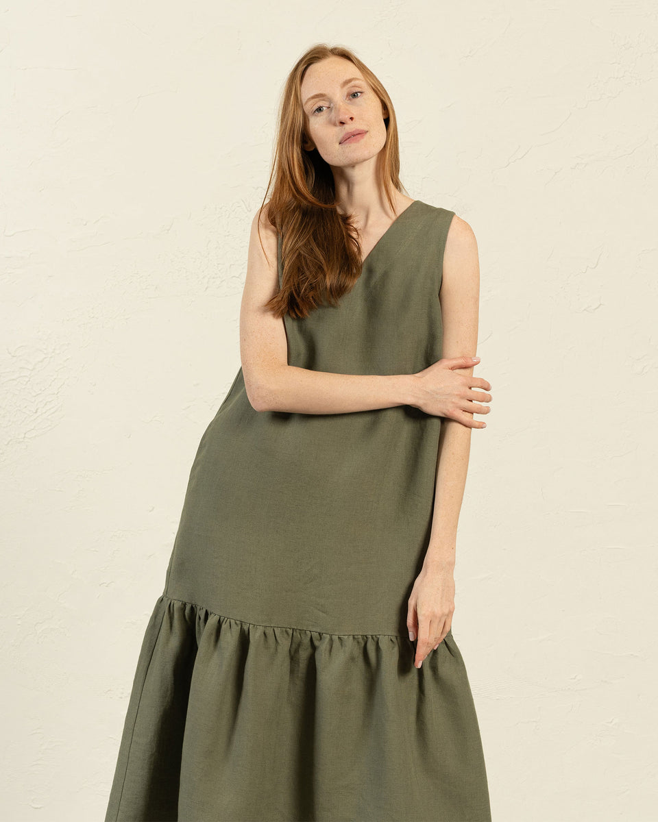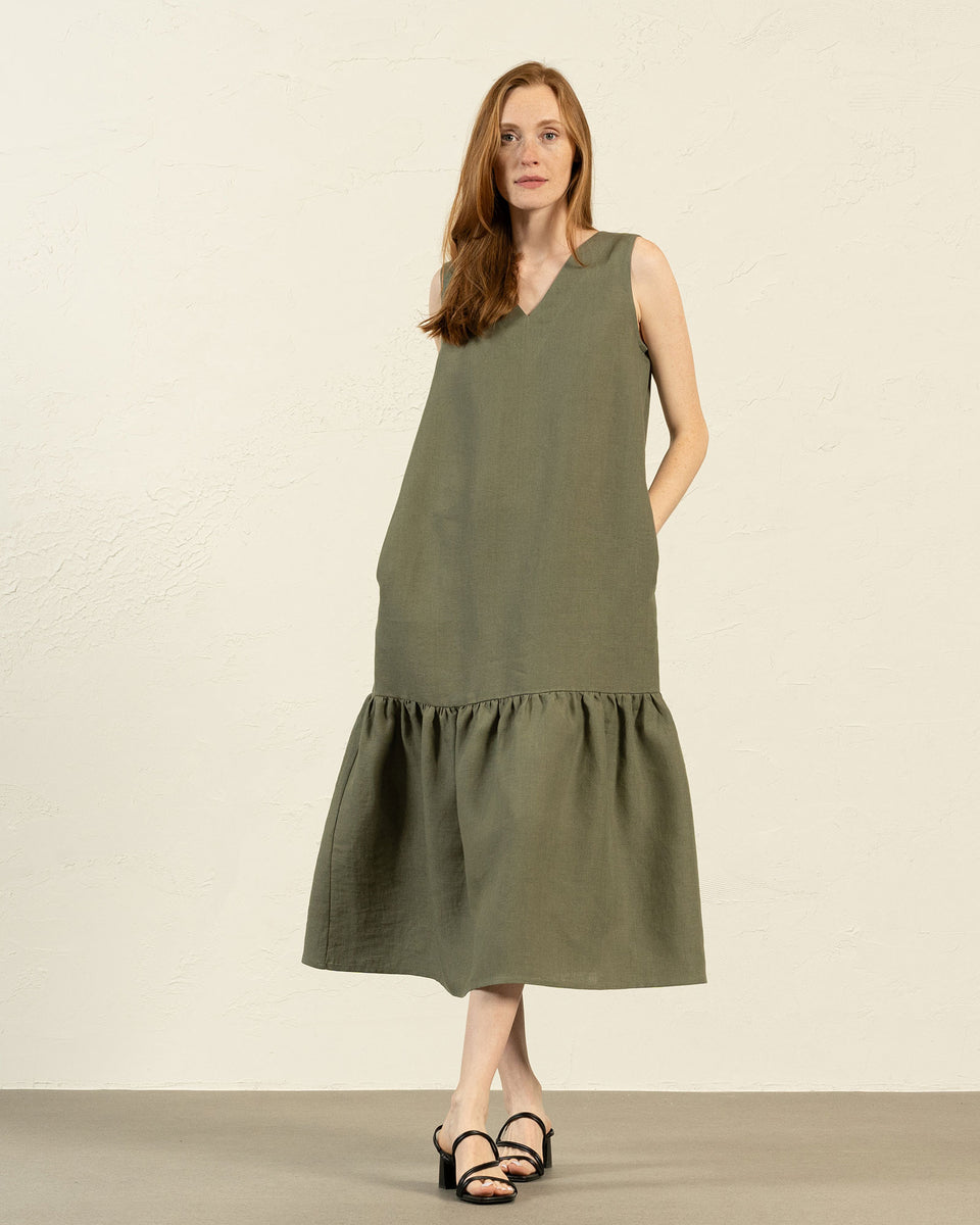 Con volantes en la parte inferior y detalles llamativos de fruncido, nuestro vestido de lino es femenino y divertido sin complicaciones. Escote en V suave, volantes juguetones en la parte inferior, bolsillos ocultos y un color atemporal hacen de este vestido de lino una prenda duradera y perfecta para lucir en las ocasiones más especiales.